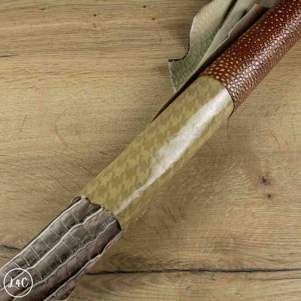 This Kid Leather Bundle, is a mixture of semi soft and semi firm kid leather. The Lizard and Croc hides are semi firm and the dog tooth is supple.