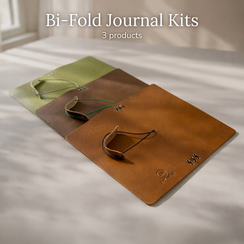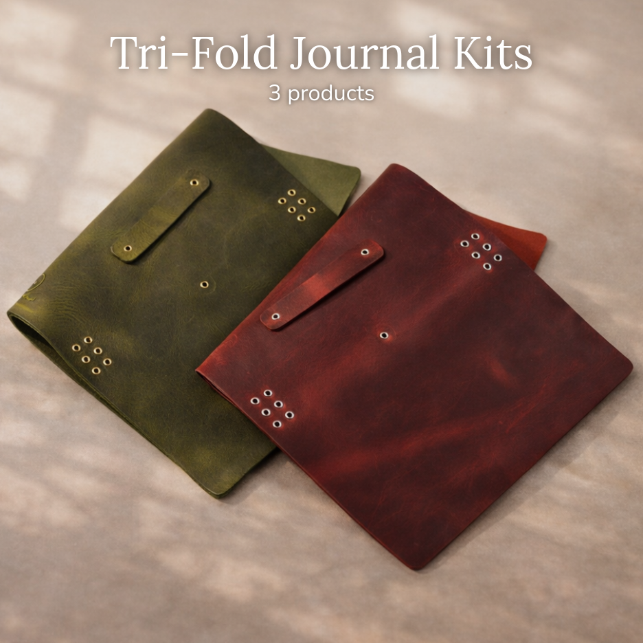 Our handcrafted Leather Journal Kit includes everything you need to make your own leather journal, featuring a premium tri-fold cover with pre-punched, eyeleted holes and rounded corners.