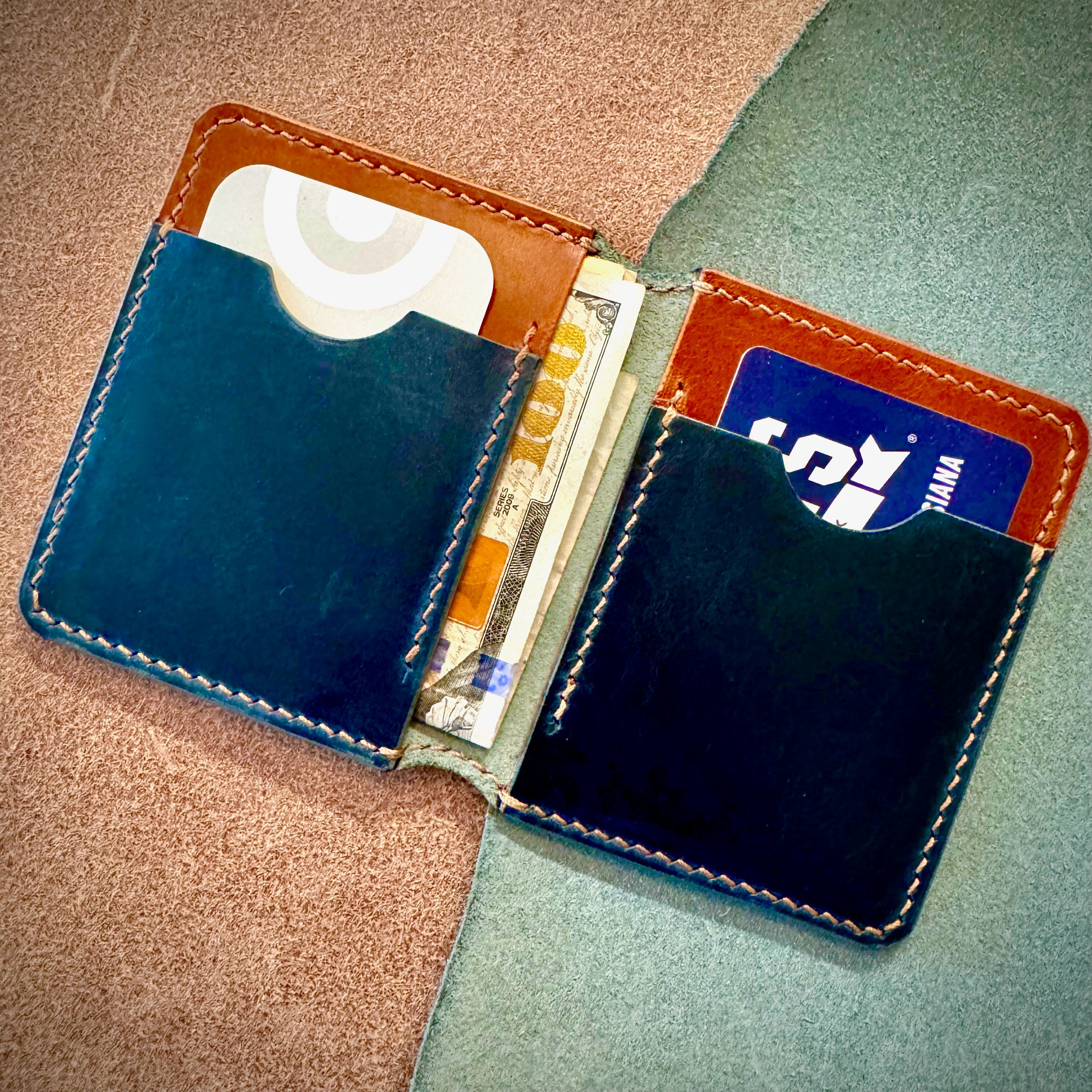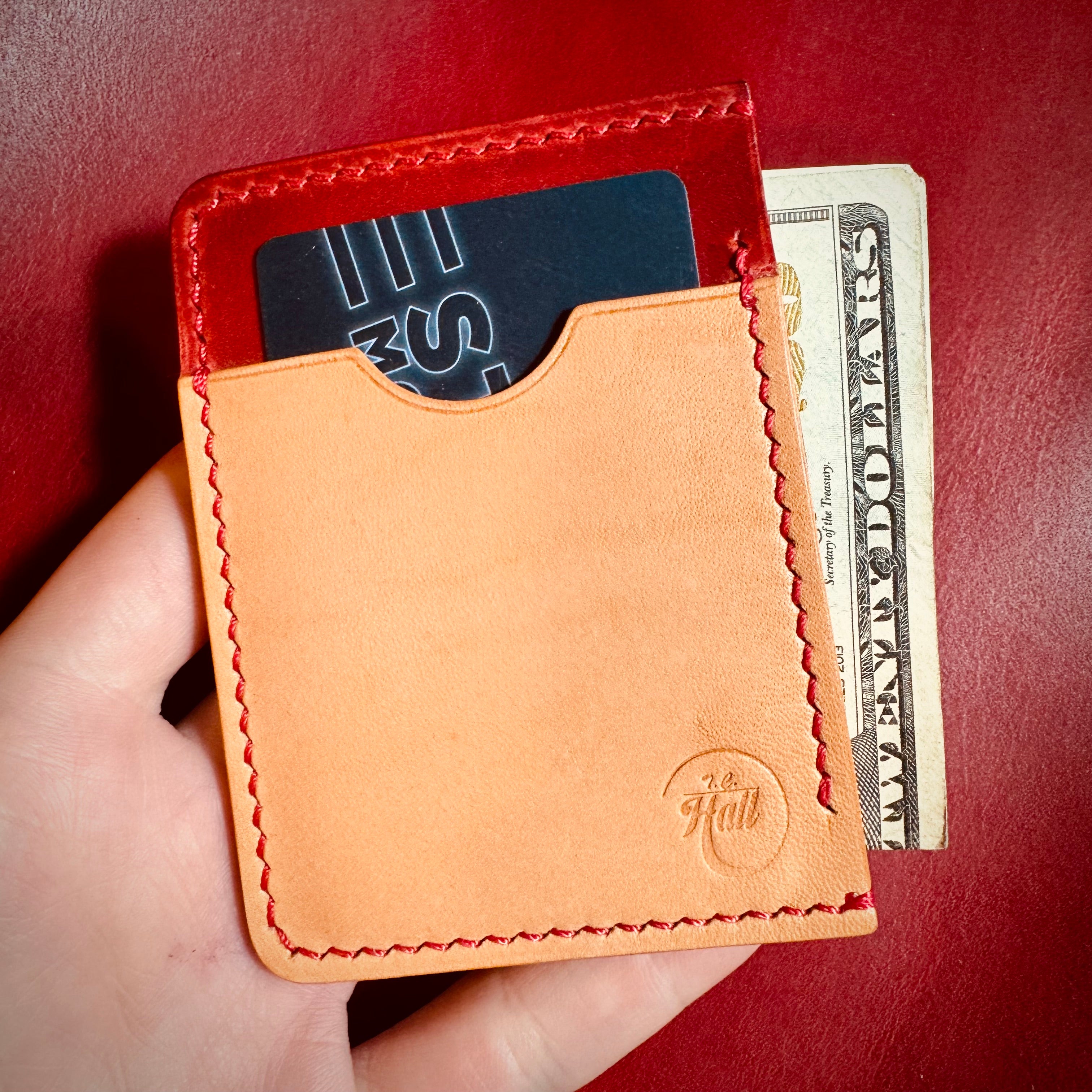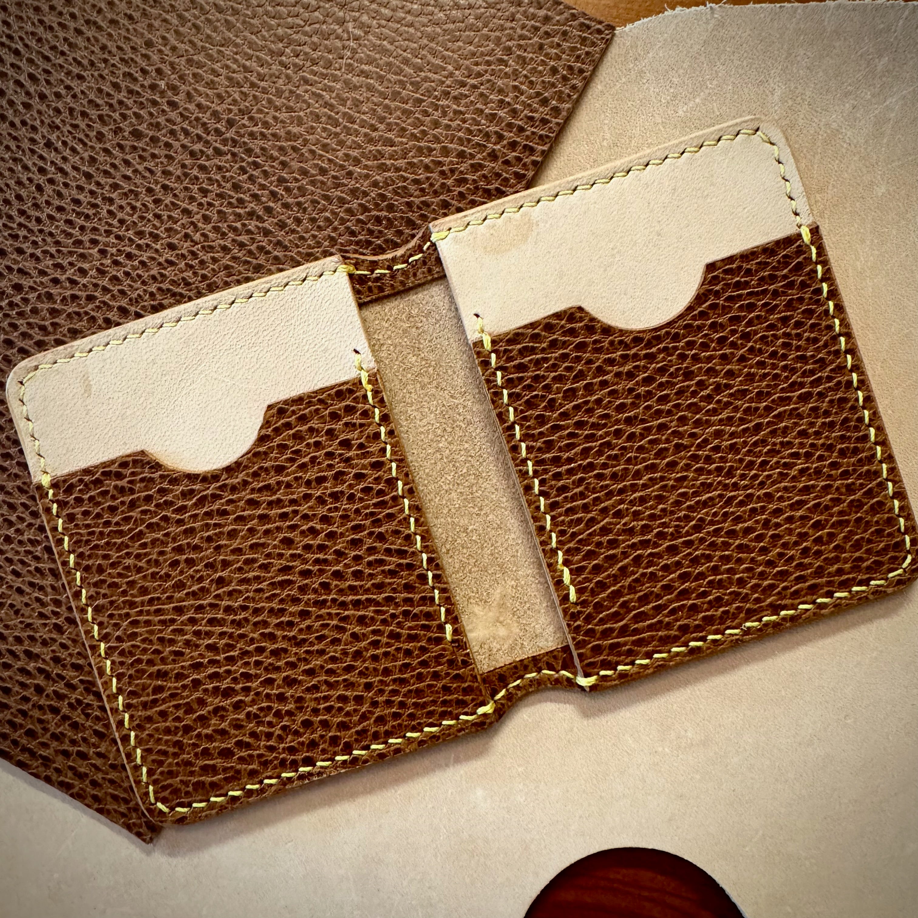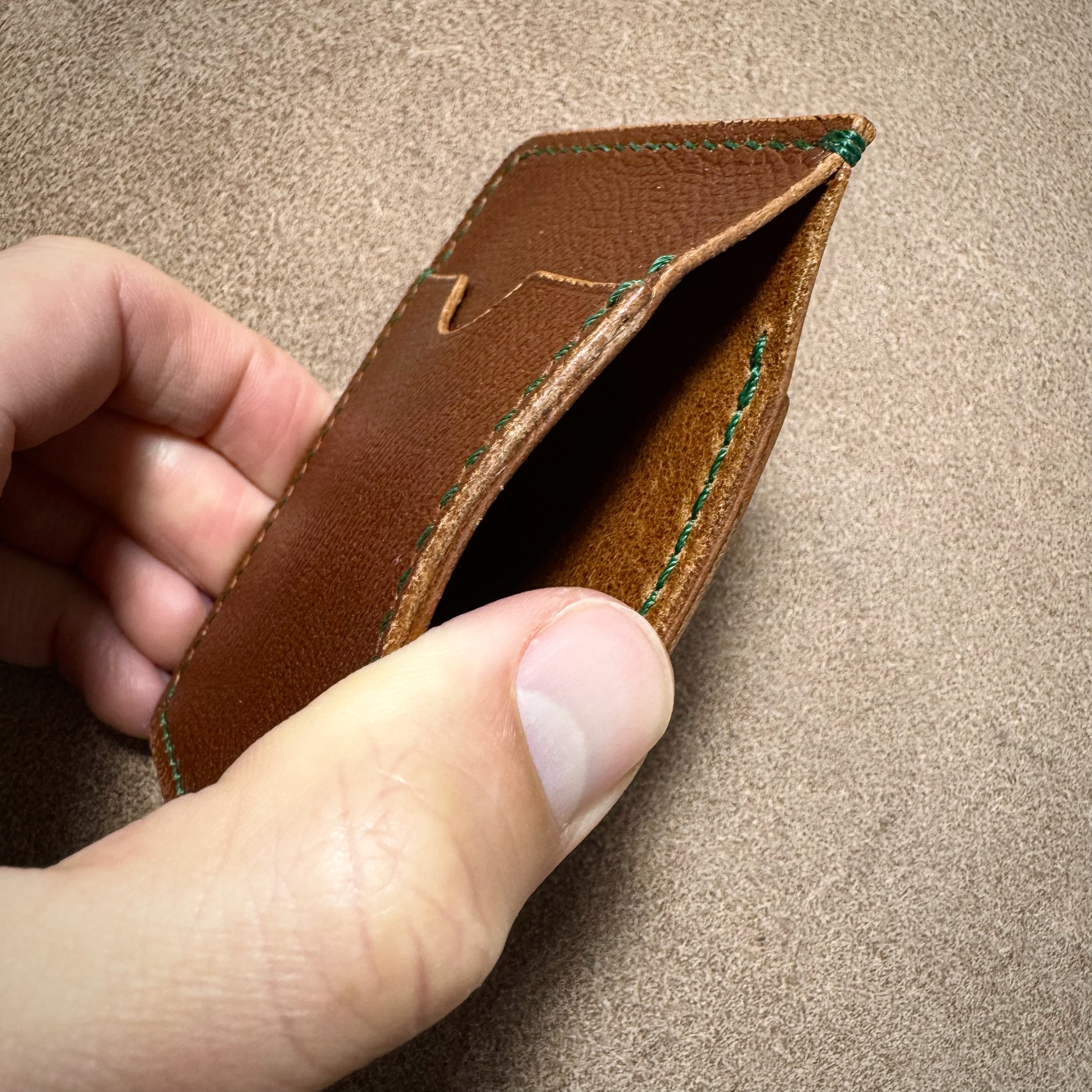 Our Trochee Cardholder (/tro-kee/) is a beginner-friendly design that features three card slots, comfortably holding 3 to 5 cards. The pattern includes two distinct pocket styles for versatility. While edge trimming, bevelling, and creasing will enhance the finished product, they are optional and not required. This pattern works well with most lower-weight vegetable-tanned leather, recommending a thickness of 2.5-3.5oz (1.0-1.4mm).